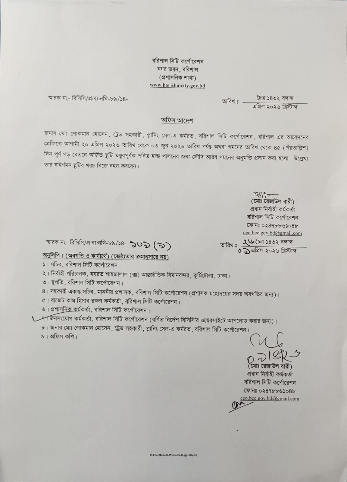 - বহিঃ বাংলাদেশ ছুটি জনাব মোঃ লোকমান হোসেন