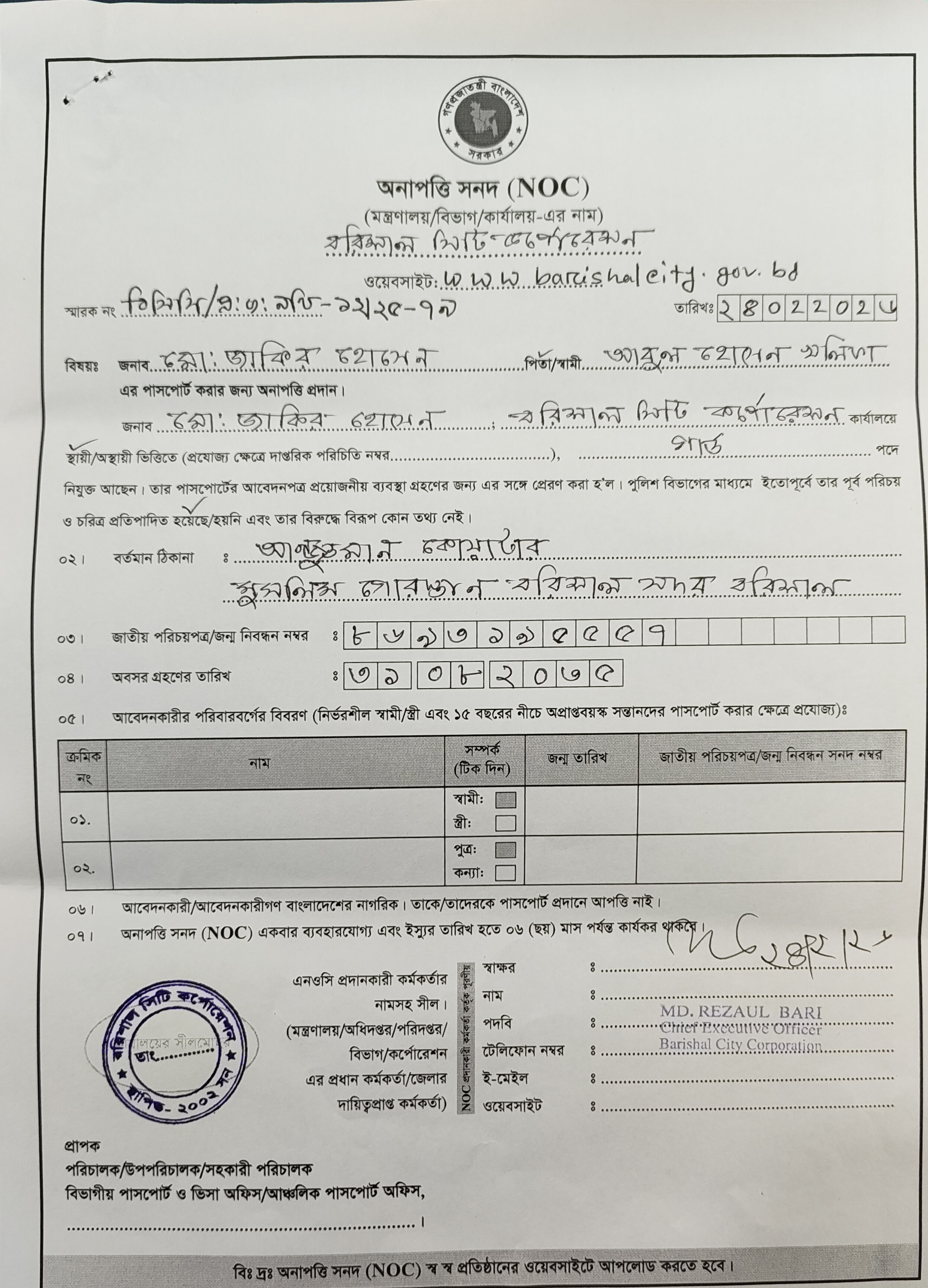 NOC মোঃ জাকির হোসেন